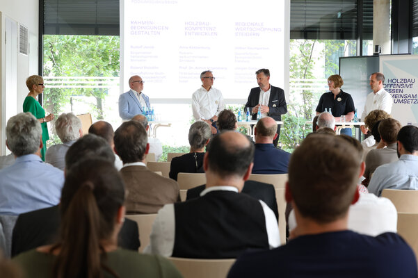 Mit den Impulsen Ökobilanz im Holzbau und Holzbaukompetenz in der Planung wurde ein vertiefter Blick auf ausgewählte Schwerpunktthemen geworfen. Die Podiumsdiskussion zu den Themendfeldern Rahmenbedingungen gestalten, Holzbaukompetenz entwickeln, Regionale Wertschöpfung steigern stand im Zentrum der Nachmittagsveranstaltung und diente auch dazu die nächsten Schritte mit Vertreter*innen aus der Verwaltung und Praxis, aus Bauherrnschaft, Hochschulen und dem Handwerk zu beraten. Aus den Erkenntnissen der Maßnahmen des letzten Jahres, des Netzwerktreffens und der Diskussionen leitet sich die weitere Vorgehensweise der Offensive ab. Stellvertretende Hauptgeschäftsführerin der AKH, Gertrudis Peters, stellte dies im abschließenden Ausblick kurz vor.