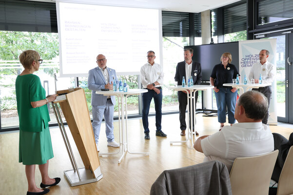 Im Zuge der Holzbauoffensive Hessen wurden die Akteur*innen entlang der Wertschöpfungskette Holz am 24. Juni 2025 in die Räume des Hessischen Ministeriums für Landwirtschaft und Umwelt, Weinbau, Forsten, Jagd und Heimat (HMLU) eingeladen, um gemeinsam einen Blick auf bereits durchgeführte Maßnahmen, aber auch in die Zukunft zu werfen.