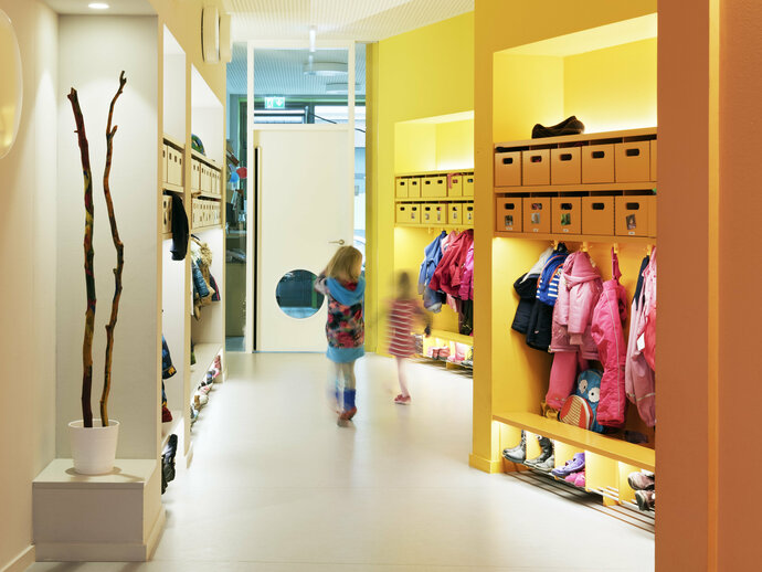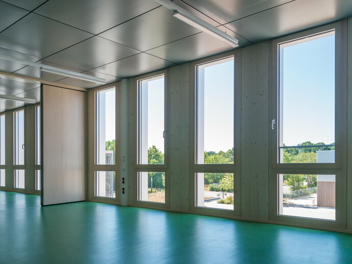Der Holzmodulbau hat seine Grenzen noch lange nicht erreicht: Er bietet hohe gestalterische Freiheiten und viel Potenzial für „offene Lernlandschaften“. Schon ein anderer Zuschnitt der Basiseinheit ermöglicht Varietät der Raumsequenzen.