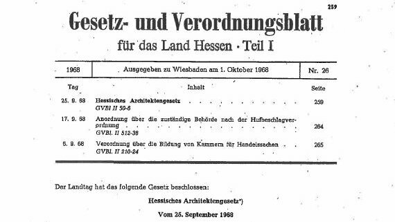 Der Hessische Landtag beschloss in seiner Sitzung am 25. September 1968 das neue Hessische Architektengesetz und legte damit den Grundstein für die Errichtung der Architektenkammer Hessen.