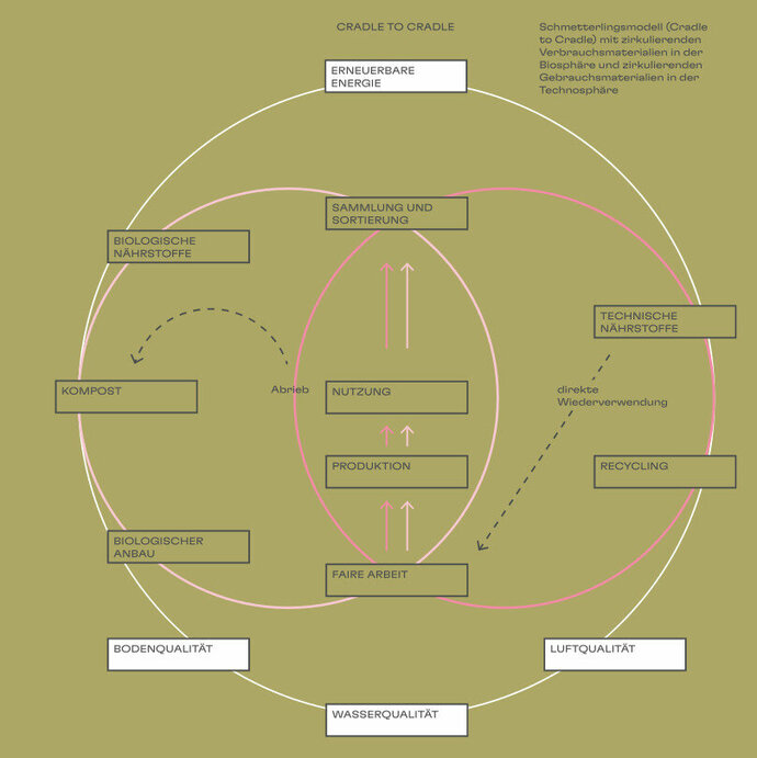 Grafische Darstellung des Schmetterlingmodells (Cradle to Cradle) mit biologischen (Biosphäre, hellrosa) und technischen Kreisläufen (Technosphäre, dunkelrosa) der Gebrauchsmaterialien.