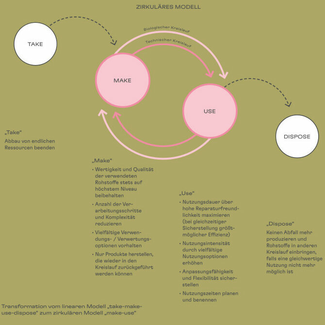 Grafische Darstellung von der Transformation des linearen Modells nach dem Prinzip „Take-Make-Use-Dispose“ in ein zirkuläres Modell nach dem Prinzip „Make-Use“.