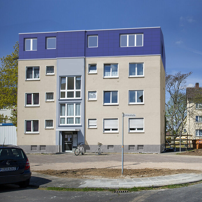 Die Aufstockungen von zwei Mehrfamilienhäusern aus den 1950er-Jahren dienen zum einen als Maßnahme der Innenentwicklung und zum anderen zur Schaffung bezahlbaren Wohnraums in der Metropolregion.