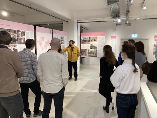 Bereits zum dritten Mal führte der Leitende Direktor des DAM Peter Cachola Schmal Nachwuchskräfte der AKH exklusiv durch die aktuelle Ausstellung. Die im September 2023 turnusgemäß neu etablierte Vertretung der freiwilligen Mitglieder führt die von ihren Vorgänger*innen gestarteten regelmäßigen Angebote zum Kennenlernen, Austauschen und Vernetzen fort. Und so hatten am 11. Januar 2024 rund fünfzehn freiwillige Mitglieder die Gelegenheit mehr zu erfahren über „Protest/Architektur. Barrikaden, Camps, Sekundenkleber“, so der Titel der Ausstellung im DAM-Interimsquartier im Frankfurter Ostend.