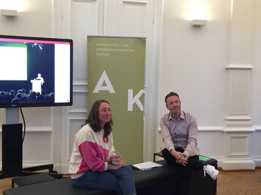 Katharina Rauh, Stadtplanerin und Partnerin bei prosa Architektur + Stadtplanung in Darmstadt, berichtete im Gespräch mit dem AKH-Referenten für Baukultur Florian Dreher über ihren Werdegang, den Weg in die Selbstständigkeit und wie sie sich dafür einsetzt, mehr Nachhaltigkeit in Architektur und Stadtplanung möglich zu machen.