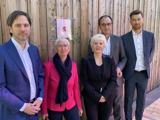 Hessens Finanzminister Michael Boddenberg enthüllte gemeinsam mit der Präsidentin der Architekten- und Stadtplanerkammer Hessen, Brigitte Holz, und Marcus Gwechenberger, Dezernent für Planen und Wohnen der Stadt Frankfurt, am 8. August 2023 die Auszeichnungsplakette des Staatspreises Vorbildliche Bauten im Land Hessen am Gebäude der Übernachtungsstätte für obdachlose Menschen im Frankfurter Ostpark.